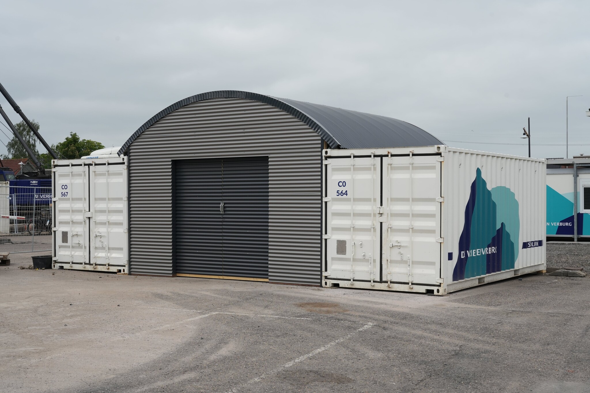 De overkapping is d.m.v. stalen hoeklijnen eenvoudig te monteren aan de hoeken (corner castrings) van de container.