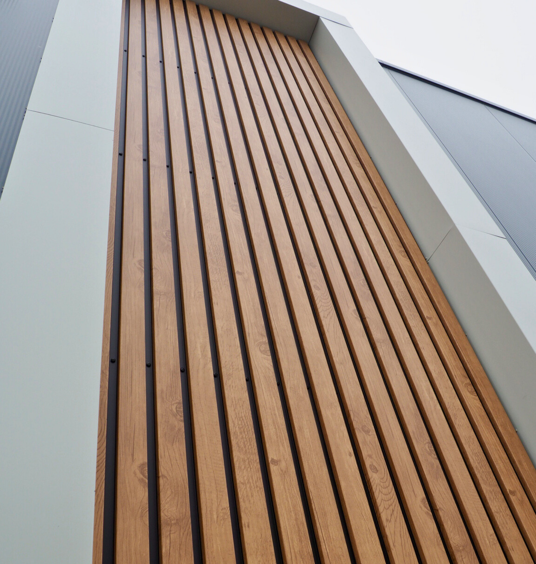 De damwand Houtlook is een smal, rechthoekig gevelprofiel dat de look van houten latten nabootst. De houtlook-afwerking combineert realistische houttextuur met diepe zwarte ribben. In tegenstelling tot traditioneel hout is metaal onderhoudsarm en eenvoudig te installeren. Montage gebeurt met zichtbare bevestigingen op een vlakke ondergrond of verstelbare structuur, zowel verticaal als horizontaal. Profielen worden overlappend geplaatst, waarbij een luchtspouw tussen isolatie en profiel wordt aanbevolen.