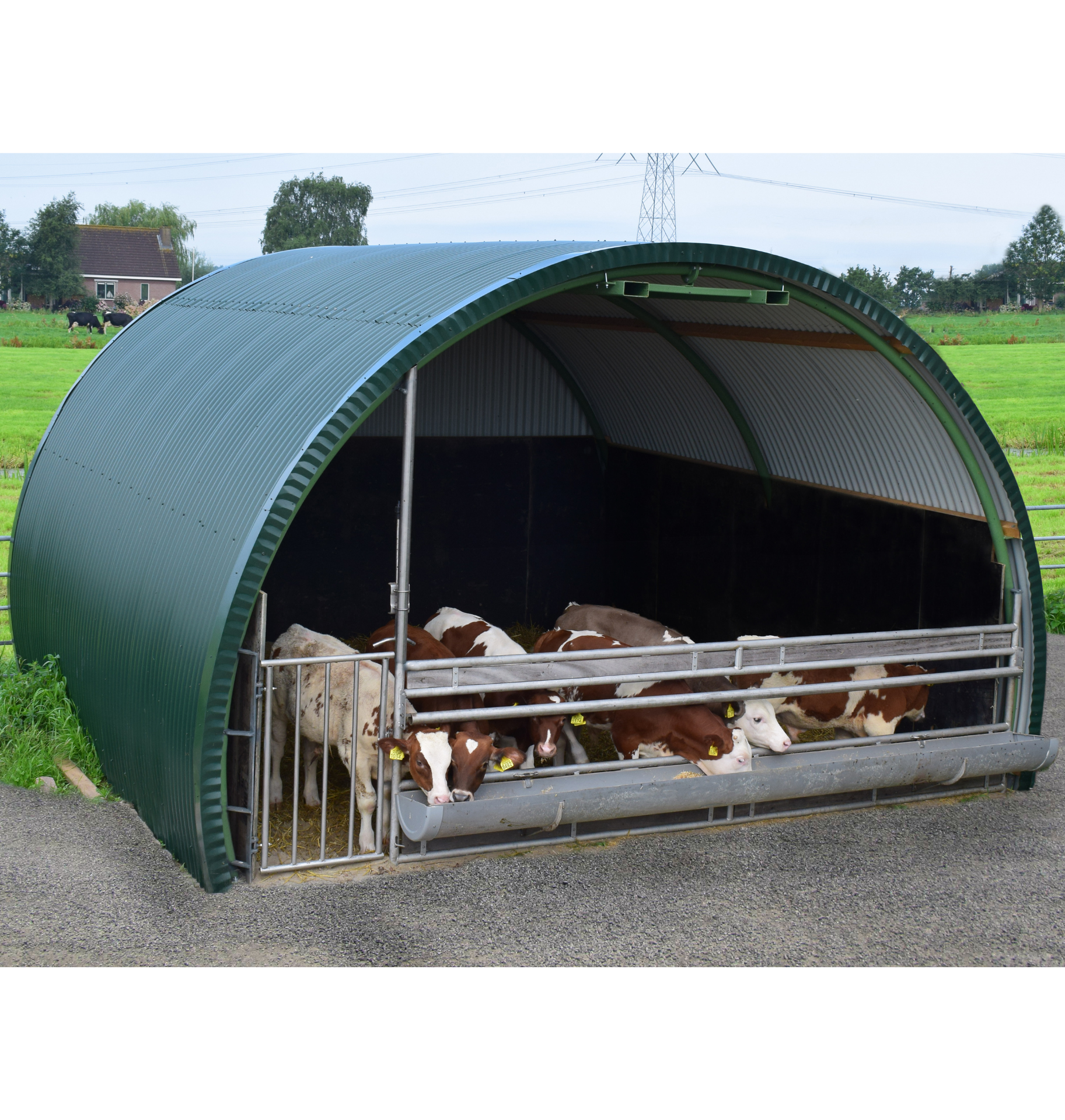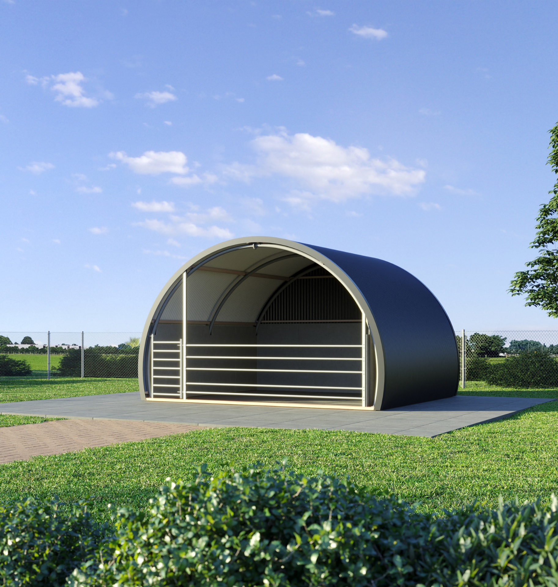Ons Dierenverblijf R5 is een moderne interpretatie van de klassieke nissenhut: een uiterst sterke, halfronde constructie die meer dan 180° doorloopt. De gebogen buisspanten en stalen beplating vormen een robuust, onderhoudsarm onderkomen voor dieren. Dankzij de doordachte vorm ontstaat maximale binnenruimte, extra loopcomfort langs de zijwanden en uitstekende weerstand tegen zware belasting en weersinvloeden.