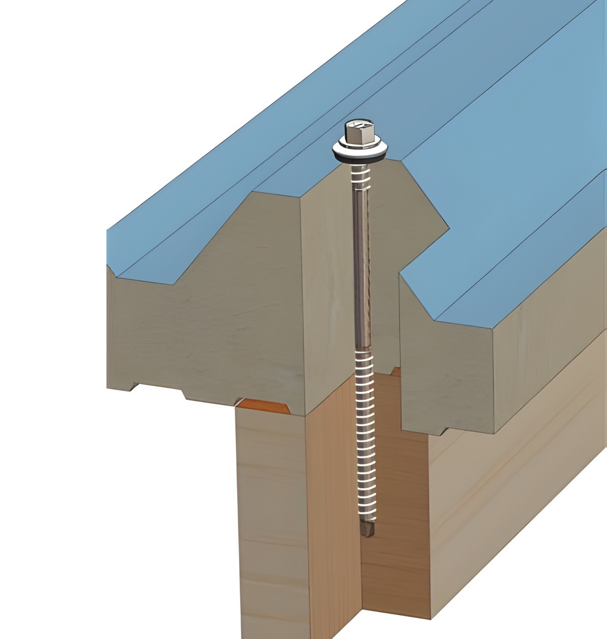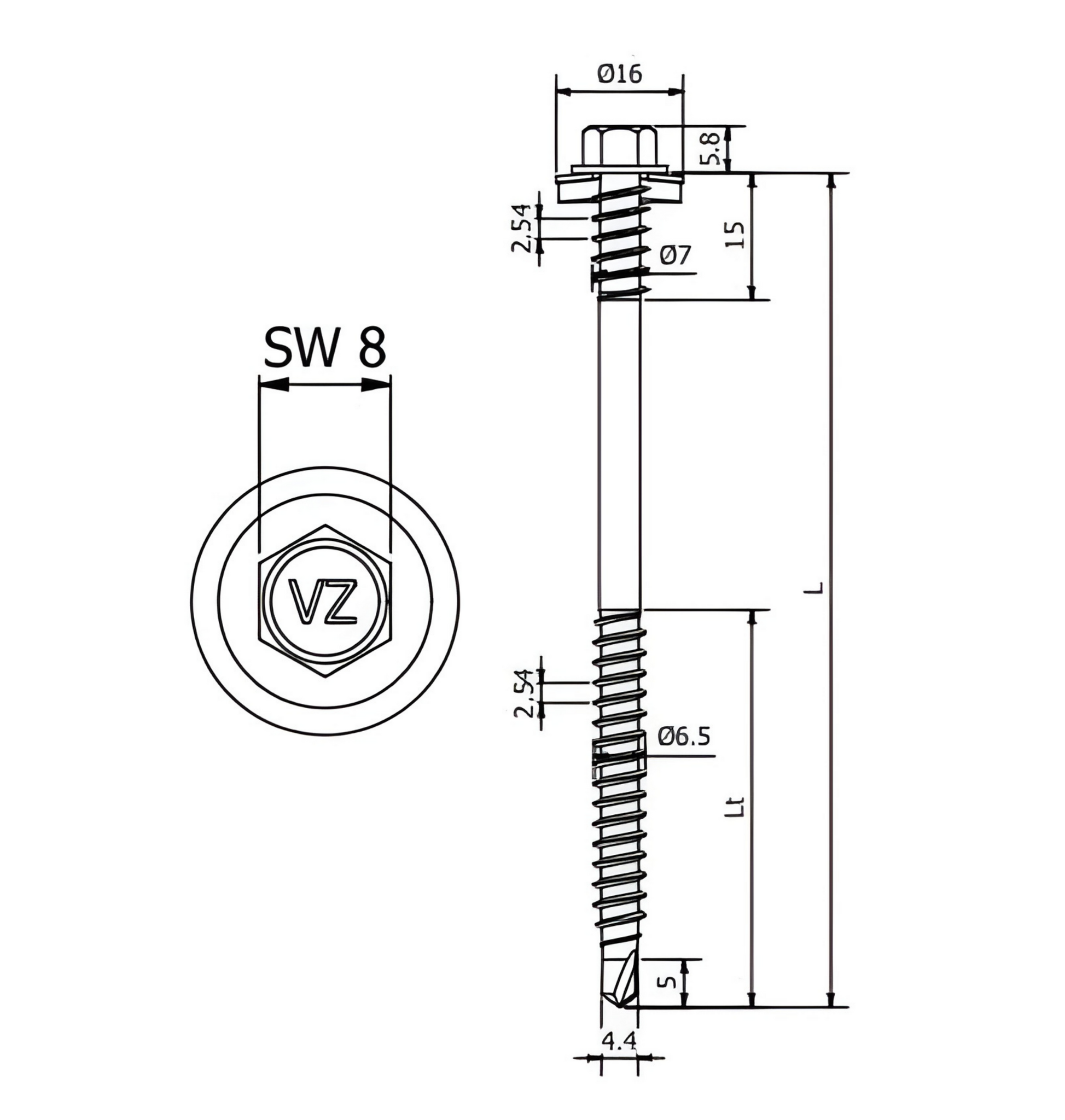 Deze verzinkte sandwichpaneelschroef is speciaal ontworpen voor een stevige en waterdichte bevestiging van sandwichpanelen op houten onderconstructies. Dankzij de zeskantkop (SW 5/16”) met aangeperste ring en boorpunt #2 is voorboren niet nodig, wat montage snel en eenvoudig maakt.